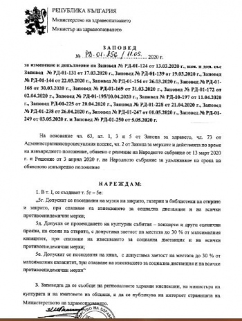 Заповедта позволява провеждането на културни събития – концерти и други сценични прояви, на сцени на открито, с допустима заетост на местата до 30% от максималния капацитет. Условието е също да бъдат спазвани социалната дистанция и въведените противоепидемични мерки.