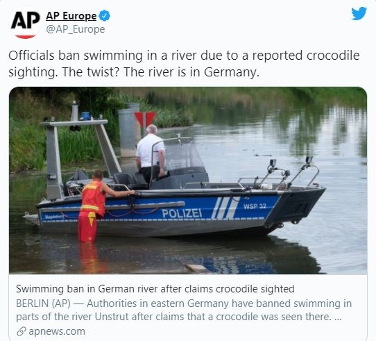 Крокодил бе забелязан в река в Централна Германия, съобщи БТА. Еднометровото младо влечуго е било заснето в град Ортенберг, на 38 километра североизточно от Франкфурт. То не представлява заплаха за хората, увери говорителката на местната полиция. Въпреки това земеделските стопани в района са предупредени да бъдат нащрек, а собствениците на домашни кучета следва да ги разхождат само на каишка.