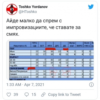 И публикува таблица. В нея са посочени пол, възраст, образование и местоживеене на гласоподавателите на различните партии. С „висше/полувисше“, гласували за „Има такъв народ“ са обозначени 18. Средно образование – 16, основно образование – 6. В колонката на ДБ са съответно: 18 – висше/полувисше, средно –4, основни и по-ниско – 2.