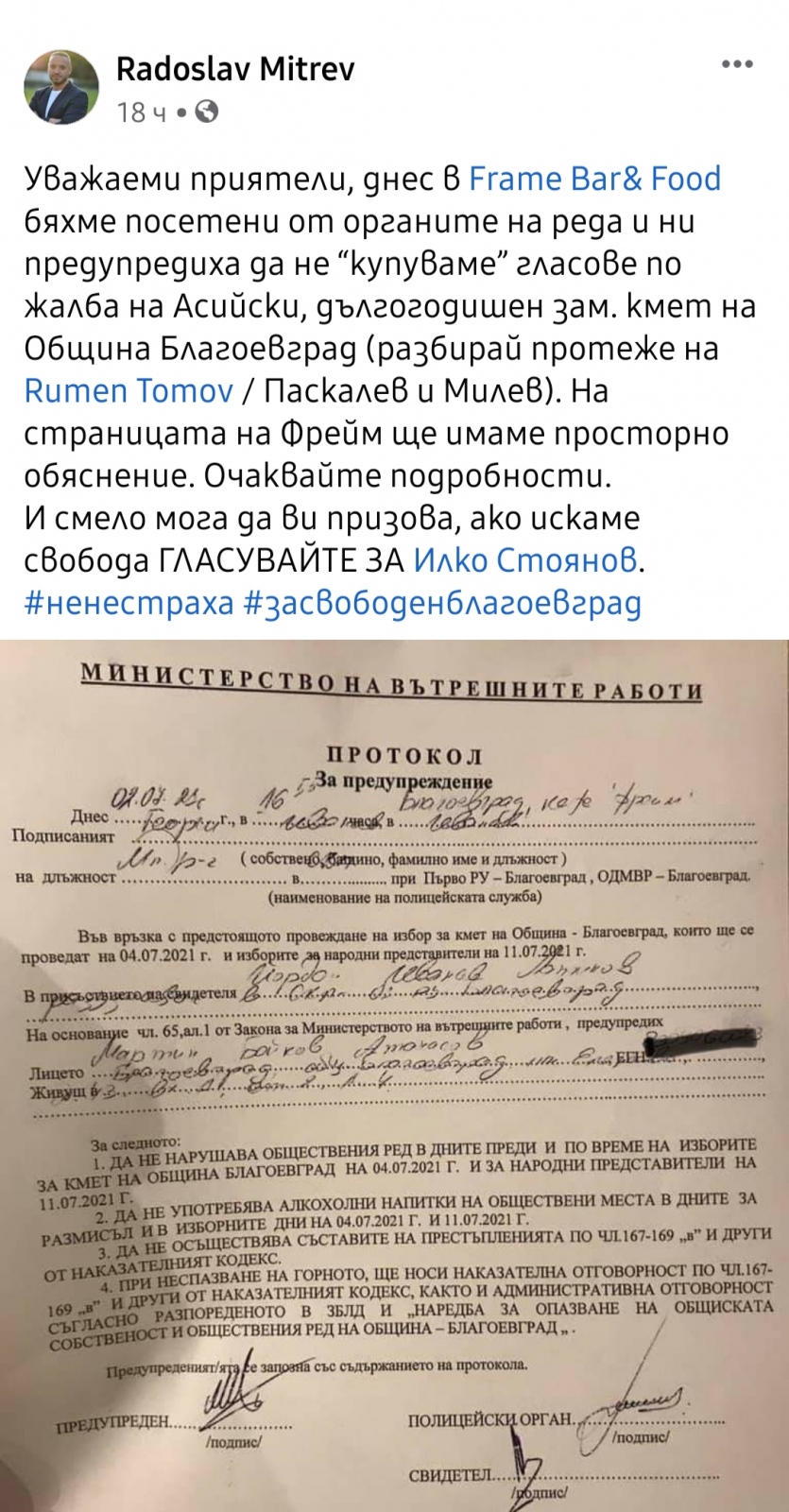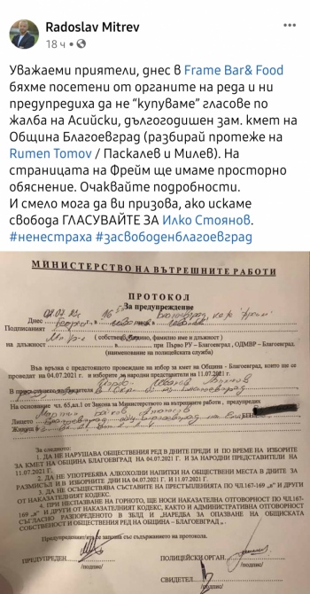 Социалните мрежи се напълниха с вопли на активисти на ИТН за това, че са тормозени от полицията, привиквани са на разпити и са съставяни протоколи да не купуват гласове. Сигналите срещу тях били подадени от бивш зам.-кмет на Благоевград по времето на Костадин Паскалев, твърдят пред Скандал местните.