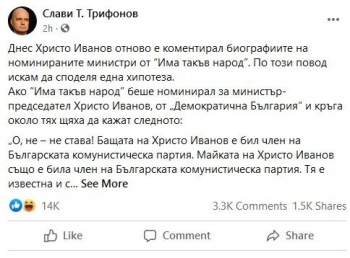 В публикацията си Трифонов атакува политическото минало на бащата и майката на Иванов, които, по думите му, били членове на БКП.