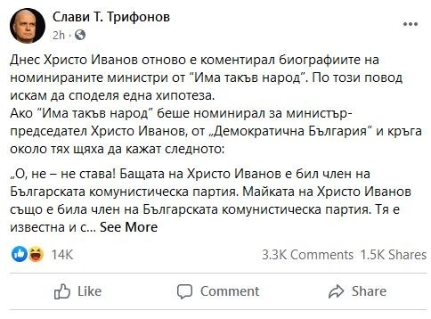 Лидерът на партия "Има такъв народ" Слави Трифонов публикува в пост във фейсбук, в който обясни защо Христо Иванов не е подходящ за министър-председател и какво щеше да стане при евентуалното му номиниране за такъв.