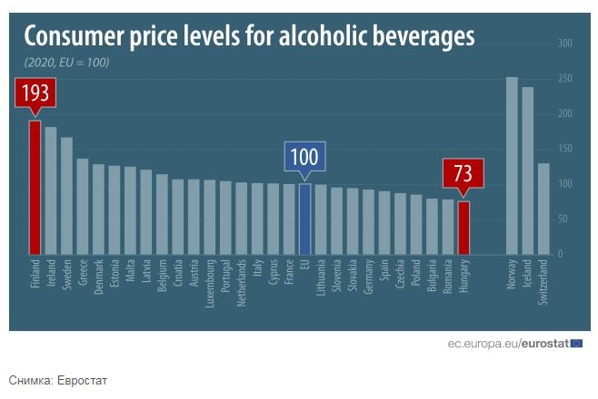 Цената в страната ни е с 19,5% по-ниска от средната за ЕС. С по-евтин алкохол от България са единствено Унгария (27,3% под средните за ЕС цени) и Румъния (26,2%).
