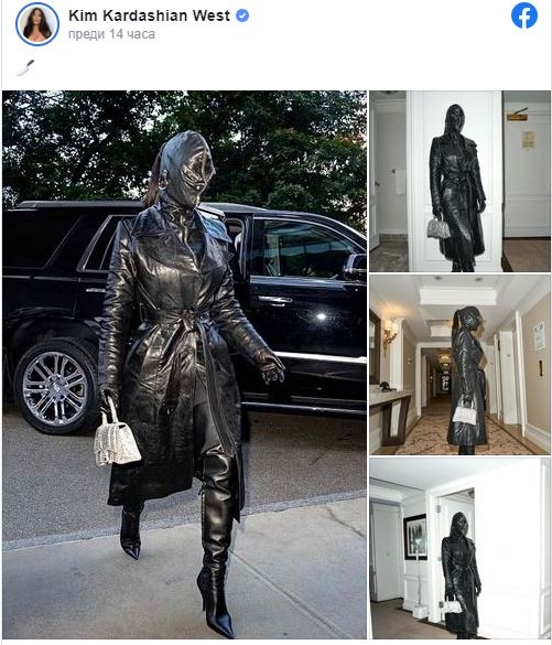 Ким Кардашиян шокира с вида си в събота, когато пристигна в Ню Йорк Сити. 40-годишната риалити звезда се появи в кожен тоалет от Balenciaga с маска, покриваща цялото ѝ лице, преди да влезе в хотел „Риц Карлтън“.