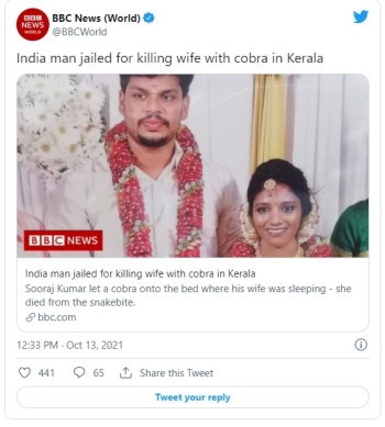 Сурадж Кумар е арестуван миналата година, след като половинката му Утра починала след ухапване от змия. Преди дни съдът установи, че отровното влечуго било пуснато в леглото на жертвата от съпруга й.