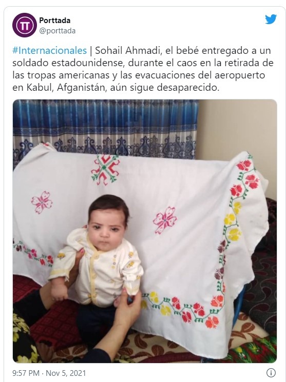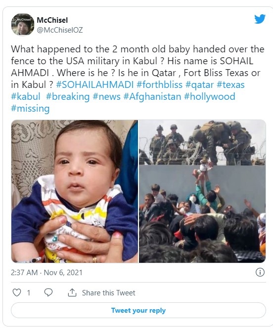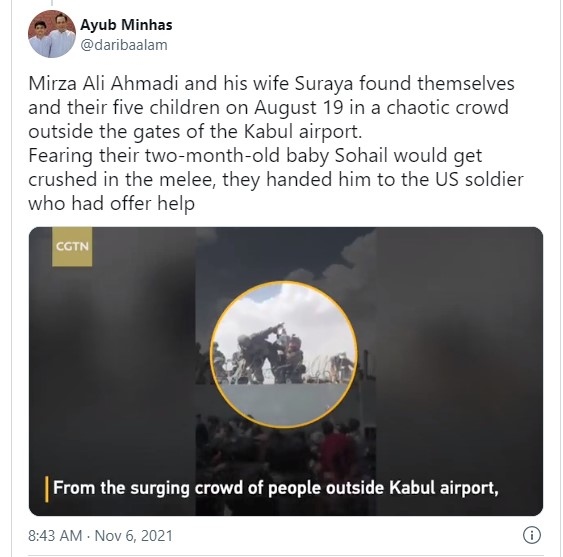 Решението е било взето за части от секундата. На 19 август Мирза Али Ахмади, неговата съпруга Сурая и петте им деца са попаднали в хаотична тълпа пред вратите на летището в Кабул, когато един американски войник се подал иззад високата ограда и ги попитал дали имат нужда от помощ. Изплашени, че двумесечното им бебе Сохаил ще бъде премазано в мелето, те го подали на войника с мисълта, че скоро ще си го вземат на входа, отдалечен едва на 5 метра.