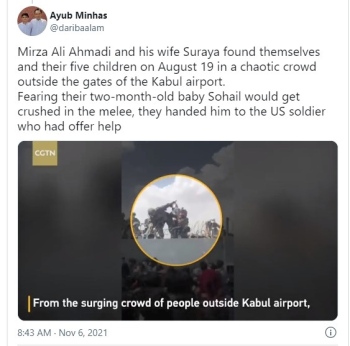 Мирза Али си спомня, че на летището в Кабул е видял и други семейства да подават бебетата си на американски войници през оградата. Видеоклип, показващ как една майка държи в ръцете си бебе, обвито в пелени, и го вдига високо над бодлива тел, разтърси социалните медии. По-късно то отново е било при родителите си.