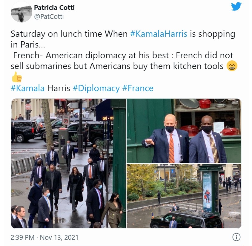 Вицепрезидентката на САЩ Камала Харис отиде на пазар в магазин за кухненски пособия в Париж, предаде Франс прес. Пред журналисти тя сподели, че си е купила оттам някои неща, които ще използва за подготовката на трапезата за предстоящия Ден на благодарността.