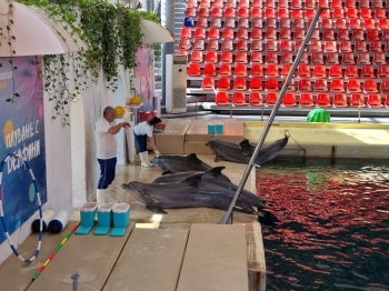 На шоуто с делфини може да видите невероятните спортни и акробатични умения на животните. Те танцуват рокендрол и валс, пеят, скачат високо, спасяват човек във водата, играят баскетбол, волейбол и футбол.