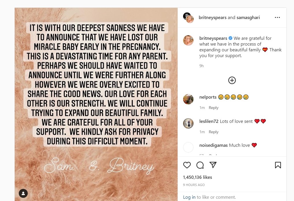 "С най-дълбока скръб трябва да обявим, че загубихме нашето чудесно бебе в ранен етап от бременността. Това е опустошителен момент за всеки родител", заяви тя в съвместна публикация с Асгари.