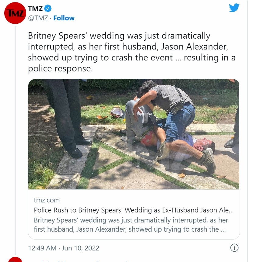 От шерифския отдел на окръг Вентура разказаха, че той е участвал във физическа схватка с охраната на залата, преди телефонът му да спре да излъчва на живо. В един момент в Instagram Live се вижда как Джейсън нахлува в шатрата в дома на Бритни и започва да крещи. Казва на един от охранителите: "Не си играй с мен".