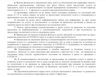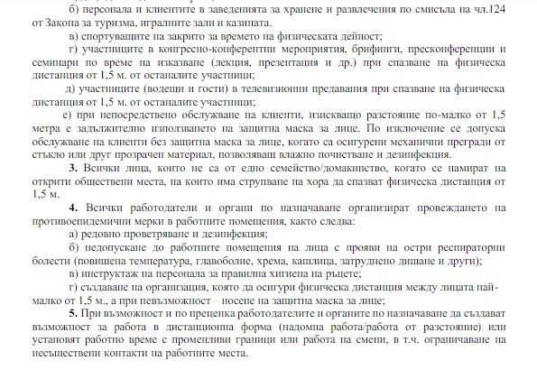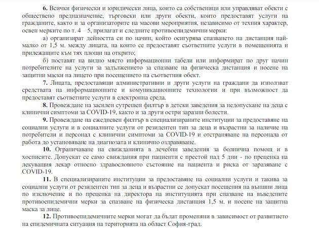 Всички лица, когато се намират в закрити места, които са достъпни за гражданите и/или са предназначени за обществено ползване, в т.ч. лечебни заведения, аптеки, оптики, специализираните институции за предоставяне на социални услуги и такива за социални услуги от резидентен тип за деца и възрастни, административни учреждения и други места, в които се обслужват или имат достъп гражданите, търговски обекти, транспортните средства за обществен превоз (трамваен, тролейбусен, метро влакове, таксиметрови автомобили и маршрутни таксита), железопътни гари, автогари, летище София, метростанции, са длъжни да имат поставена защитна маска за лице за еднократна или многократна употреба.