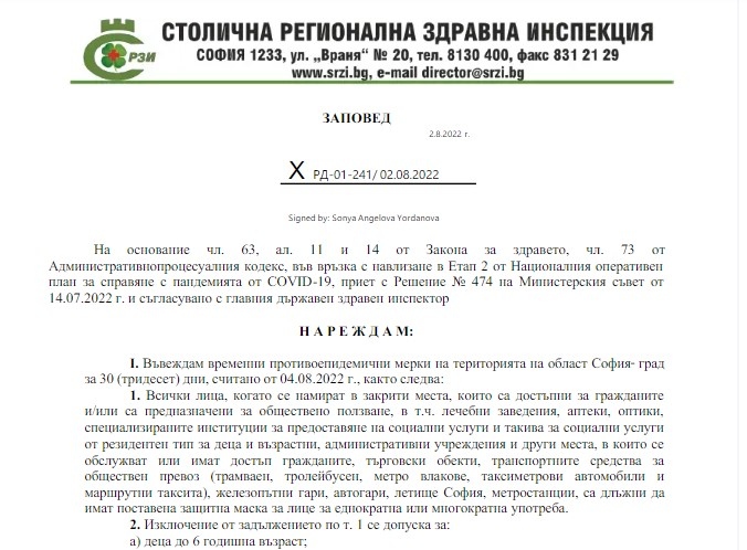 На територията на София се въвеждат нови мерки срещу разпространението на коронавируса. Заповедта на Столичната РЗИ влиза в сила от 4 август.
