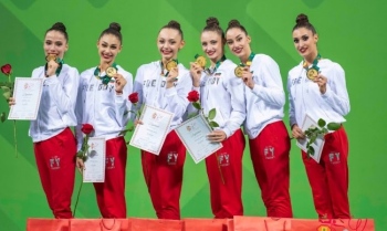 Ансамбълът на България триумфира с титлата във финала на три ленти и две топки на Световното първенство по художествена гимнастика в София. Момичетата на треньора Весела Димитрова бързо успяха да се съвземат от осмото място на пет обръча и изиграха брилятно композицията си пред изпълнените до краен предел трибуни на зала “Арена Армеец”. Женина Трашлиева, Рейчъл Стоянов, София Иванова, Маргарита Василева, Камелия Петрова и Радина Томова получиха оценка 33.300, от които 16.500 за трудност, 8.600 за артистичност и 8.200 за изпълнение.