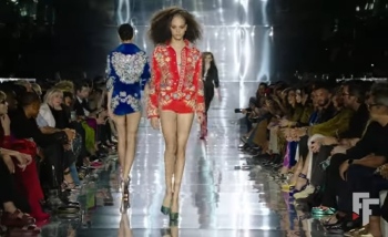 Том Форд съчетава къси кадифени шорти с якета в ярко червено и синьо, изпъстрени с цветя, листа, пеперуди и ресни. Бюстиетата са прозрачни, а панталоните предимно в сребристо-златистата гама.