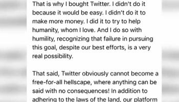 За изненада на мнозина Мъск побърза да добави, че Twitter няма да бъде платформа на омразата и разделението. „Не го направих, защото ще бъде лесно. Не го направих, за да изкарам повече пари. Направих го, за да помогна на човечеството, което обичам”, уточни той.