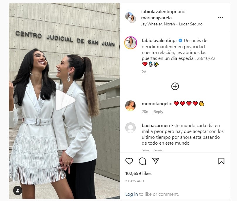 Моделите Мариана Варела и Фабиола Валентин, съответно Мис Аржентина и Мис Пуерто Рико, обявиха чрез клип в социалните медии, че са сключили брак. Връзката им, която до този момент беше скрита, се зародила на последното им участие на конкурса Miss Grand International.