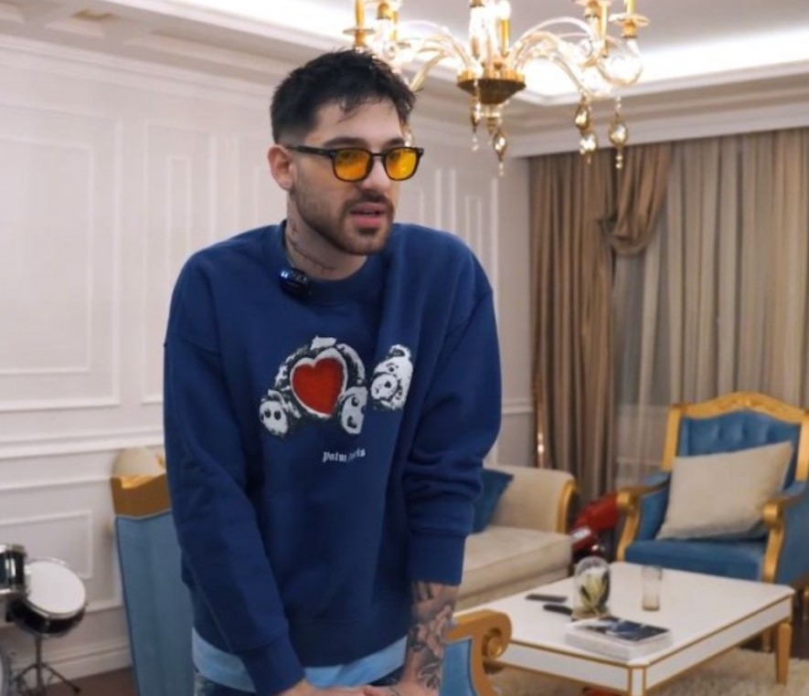 Поп фолк изпълнителят го раздава по кралски, защото както добре се вижда от видеото, целия му апартамент е буквално позлатен в комбинация с бяла кухня, хол и мебели.