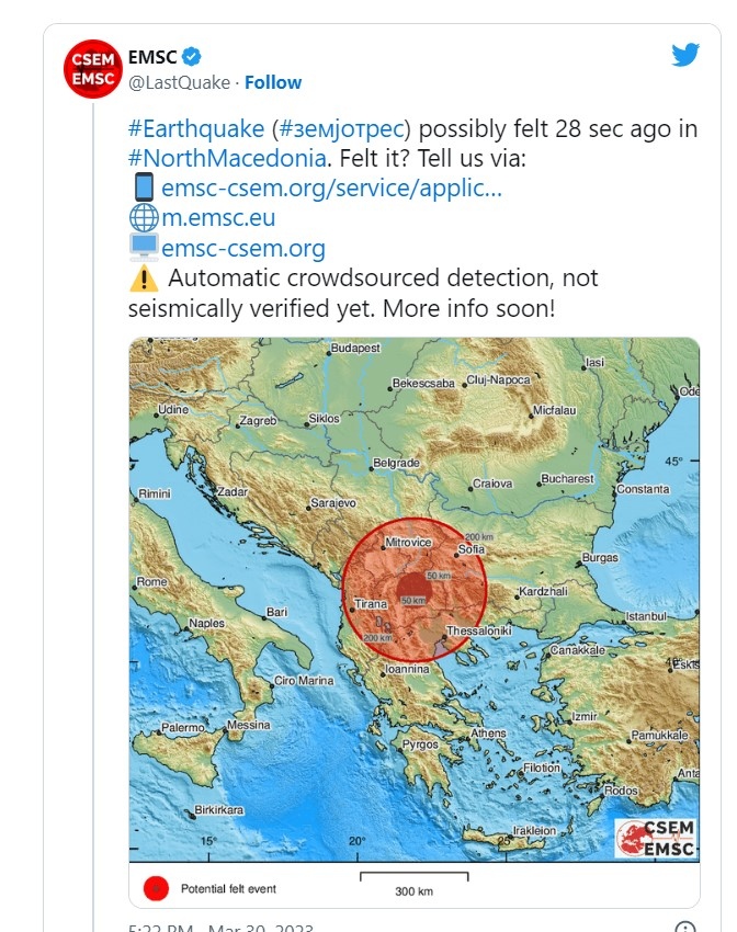 Трусът с дълбочина от 5 километра е станал на 71 км от Скопие и на 2 км от Щип. Той е регистриран в 16:21 ч. местно време, пишат от Европейския сеизмологичен център.