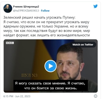 „Аз мисля, че той се страхува за живота си. Смятам, че ако той не спре да заплашва света, не само Украйна, но и целия свят, защото последствията биха били за целия свят, то светът ще намери начин как да го лиши от живот“, казва евфемистично украинският лидер пред британската медия. В оригинал Зеленски използва израза "життєдіяльність", което се превежда като жизнена дейност, жизнени функции.