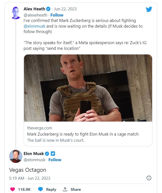 Двама от най-известните техномилиардери в света - Илон Мъск и Марк Зукърбърг - се уговориха да се изправят един срещу друг в октагона. Мъск публикува съобщение в собствената си социална мрежа Twitter, че е готов "за битка в клетката" (сленг за ММА октагона). Основателят на Facebook му отговори в същия стил - "изпрати ми локацията", предаде Клуб Z.