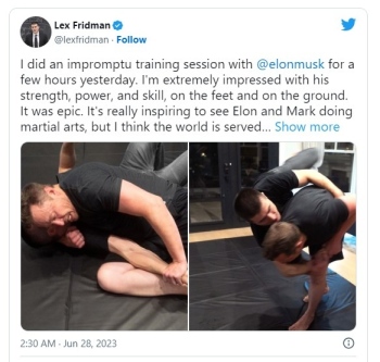 Илон Мъск се готви активно за мача си с Марк Зукърбърг, съобщи в Туитър Лекс Фридман, известен с черен пояс по джу-джицу, който има собствен подкаст.