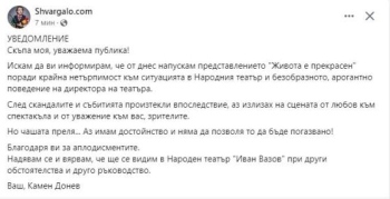 Актьорът Камен Донев няма да участва повече в представлението на Народния театър "Иван Вазов" "Животът е прекрасен" заради "крайна нетърпимост към ситуацията в Народния театър и безобразното, арогантно поведение на директора на театъра".