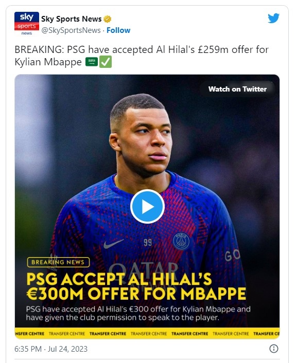 Ако сделката стане факт, то Мбапе ще се превърне в най-скъпия футболист в света и ще подобри рекорда на настоящия си съотборник Неймар, за когото парижани платиха 222 милиона евро през 2017-а година. Рекордната оферта на Ал Хилал не е единствената, която в ПСЖ са получили. Към тях са се обърнали клубове с комбинация от оферти, включително пари плюс играчи, но арабският клуб е показал сериозно намерението си, като е предложил рекордна оферта. На „Парк де Пренс“ смятат, че най-малко пет клуба се интересуват от Мбапе, сред които Челси, Тотнъм, Манчестър Юнайтед, Интер и Барселона.