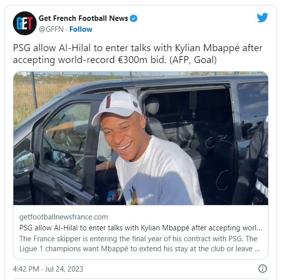 Френският шампион Пари Сен Жермен е приел рекордната оферта на Ал Хилал от 300 милиона евро за голямата си звезда Килиан Мбапе, пише Sky Sports. Информацията гласи, че на нападателя му е било разрешено да преговаря директно с клуба от Саудитска Арабия.