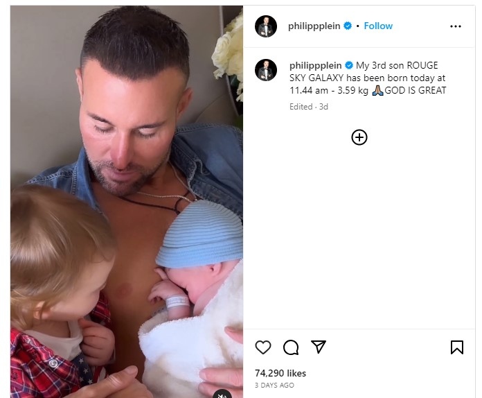 Преди няколко дни повелителят на ексцентричната мода публикува в личния си Instagram профил кратко видео, с което разкри на своите над три милиона последователи в платформата, че половинката му Лучия Бартоли го е дарила с още един наследник, пише dir.bg. На кадрите се вижда как четиридесет и пет годишният популярен дизайнер стои седнал на кожен стол, заобиколен от внушителни букети с жълти рози, държейки на ръце двамата си сина, по-големият от които се радва на своето по-малко братче, спящо спокойно върху оголените гърди на своя татко, чиято дънкова риза е разкопчана.