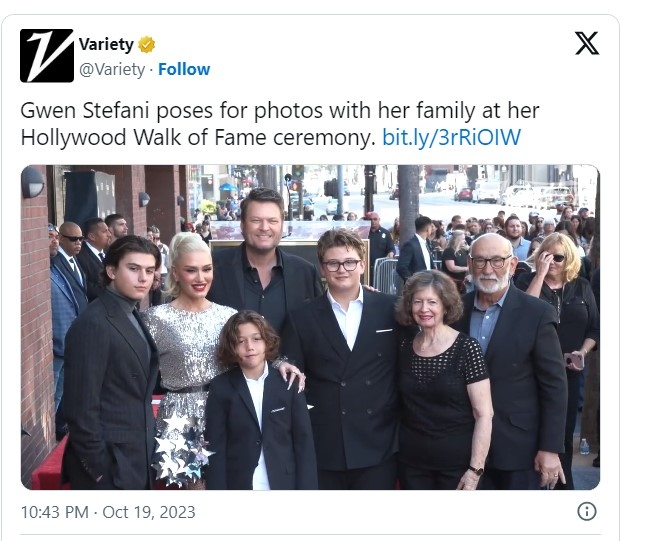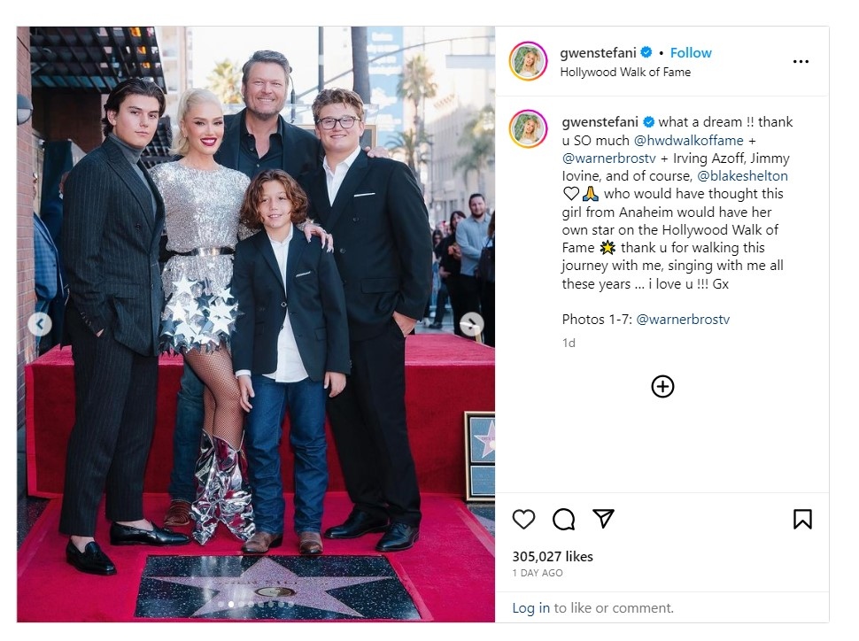 Съпругът на певицата, кънтри звездата Блейк Шелтън, я похвали на събитието по откриването на звездата.