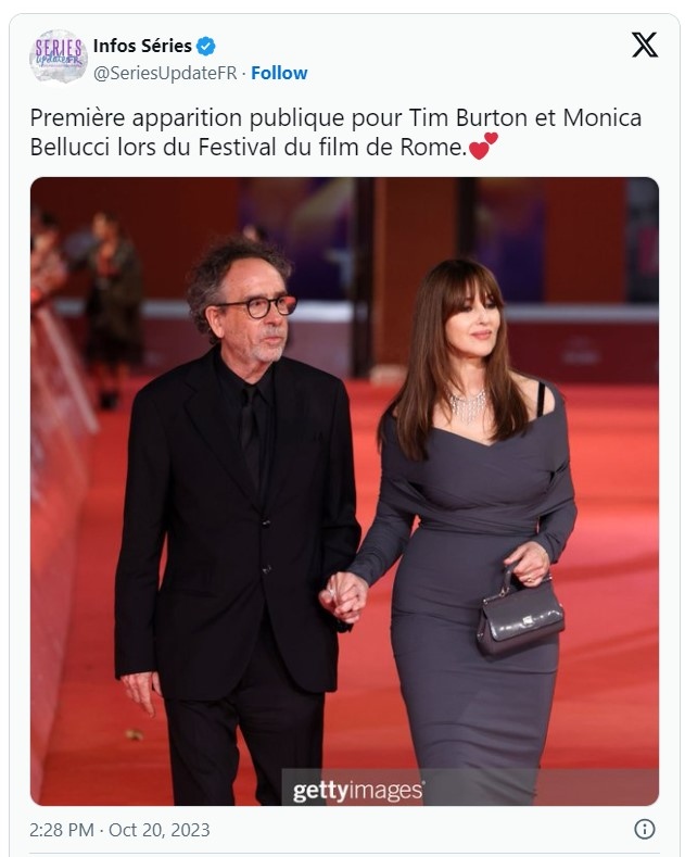 Двамата пристигнаха на премиерата на лентата "Diabolik Chi Sei", в който италианката има роля, като нито за момент не пуснаха ръцете си, докато поздравяваха присъстващите фенове и медии. Моника отново възхити присъстващите с невероятната си визия, пристъпвайки облечена в прилепнала дълга рокля, която ясно очертаваше красивата ѝ фигура. Тим Бъртън пък не свали усмивката от лицето си, ясно показвайки гордостта, която изпитва към любимата си.
