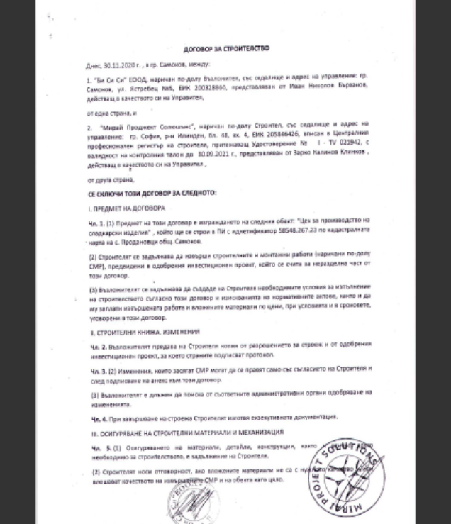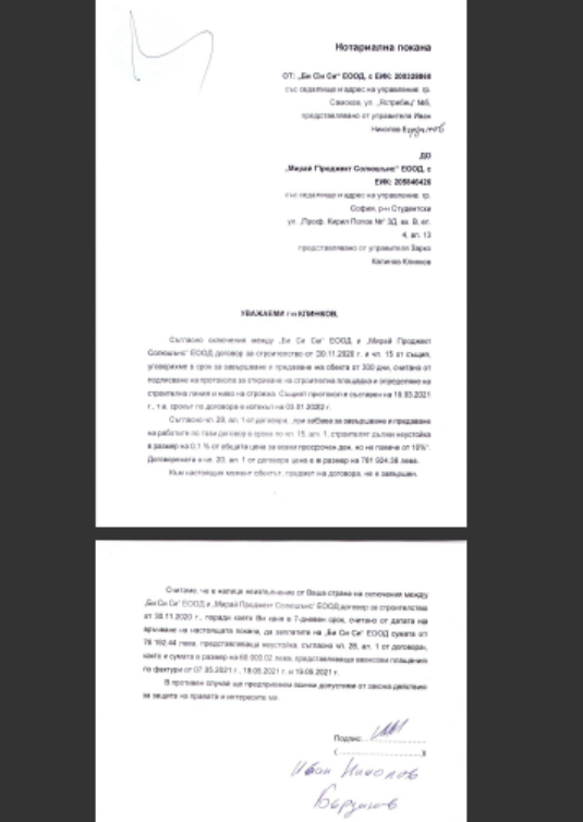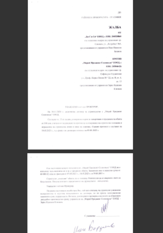 Икономическите ми планове бяха премазани благодарение на фирма "Мирай Проджект Солюшън" ЕООД с управител Зарко Калинов Клинков и към настоящия момент на лице е недостроена сграда, която не отговаря параметрите заложени в сключения договор и заплатените по него суми. Некоректността на фирмата и в частност нейният управител, умишлена или не, проваля години труд, проваля бизнес стратегия, която имаше за цел в новопостроената база да бъдат разкрити нови работни места и чрез бизнеса си да подпомогна жителите в региона.