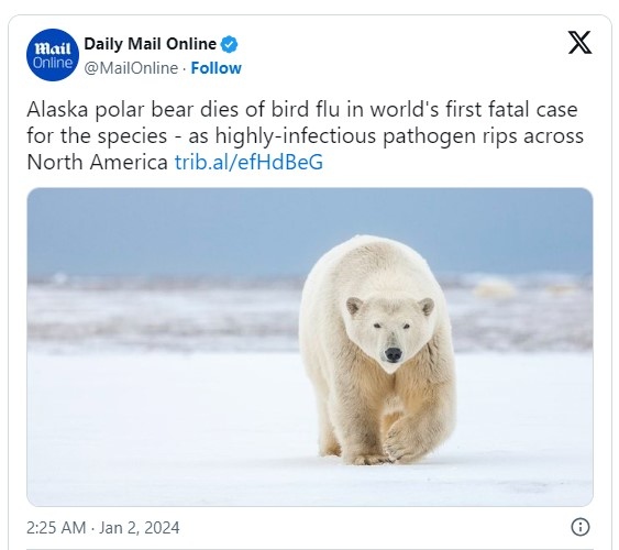 Полярна мечка почина от птичи грип в САЩ, съобщи "Гардиън". Настоящата вълна на варианта H5N1 се разпространява в цял свят от 2021 г., убивайки милиони птици и хиляди бозайници.