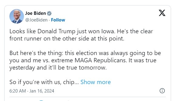 Американският президент Джо Байдън реагира в социалната мрежа "Екс" на победата на бившия президент Доналд Тръмп на първичните избори на републиканците в щата Айова, съобщава БТА.