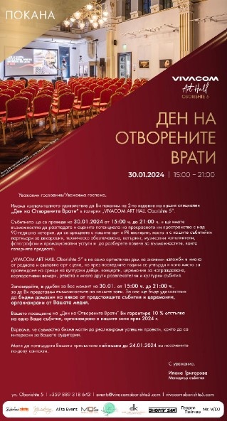 “VIVACOM ART HALL Oborishte 5“ Ви кани на 2-то издание на „Ден на Отворените Врати“. Събитието ще се проведе на 30.01.2024 г. от 15:00ч до 21:00ч., като ще имате възможността да разгледате и оцените потенциала на прекрасното ни пространство с над 90-годишна история. Да се срещнете с нашите арт и PR експерти, както и със събитийните ни партньори: за декорация, техническо обезпечаване, кетъринг, музикални изпълнители, фотографски и промоционални услуги. Да разберете повече за възможностите, които предлагаме.