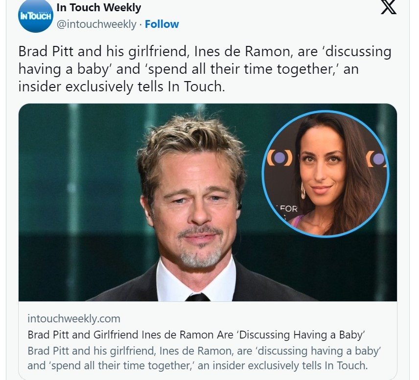 Таблоидът In Touch съобщава, че 60-годишният Брад Пит и половинката му - 34-годишната Инес де Рамон, мислят за бебе. Източник споделил пред репортери, че актьорът иска отново да се почувства баща, след като децата му и тези на Анджелина Джоли се отвърнаха от него заради развода му с майка им. "Връзката на Брад и Инес стана наистина сериозна: тя се премести при него и обсъждат да имат бебе. За някои това може да е шок, но близките им няма да се изненадат, ако тя вече е бременна", каза източникът, предава БГНЕС.