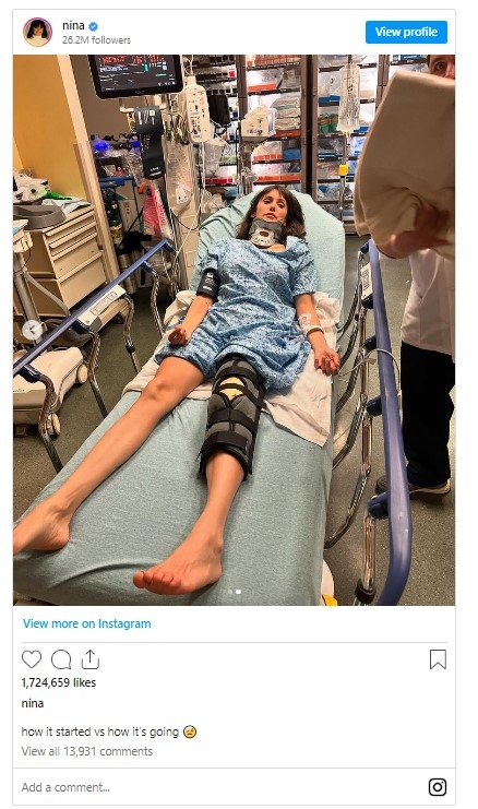 В публикация в Инстаграм актрисата публикува две снимки. На едната тя е върху електрически велосипед, а на следващата - с шина на врата и гипс на левия крак.