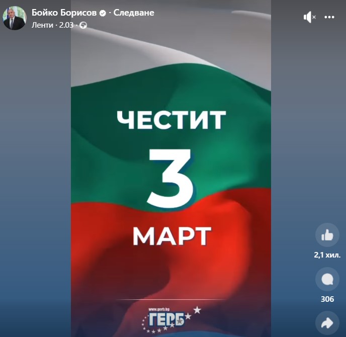Лидерът на ГЕРБ Бойко Борисов публикува във Facebook клип с родния трибагреник, а музикалният фон е националният ни химн. "Честит 3 март", написа политикът.