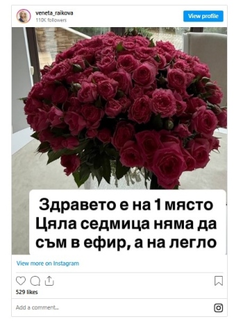 Секси миньончето съобщи с кратък текст, че ще отсъства от екран заради здравословен проблем. "Здравето е на първо място. Цяла седмица няма да съм в ефир, а на легло", писа най-скандалната водеща в последно време.