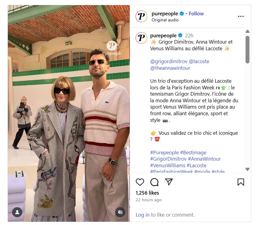Бившият №3 в света влезе в ролята на манекен на Lacoste и прикова вниманието на фотографите с визията си. Той се появи в компанията на две свои много добри приятелки - бившия главен редактор на Vogue Анна Уинтур и на легендата в тениса Винъс Уилямс, която също е лице на френския моден бранд.