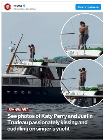 Интернет пространството гръмна след интимните кадри на Кейти Пери и Джъстин Трюдо. След месеци слухове, че двамата имат повече от приятелски отношения, медиите бяха разтърсени, а хиляди фенове развълнувани повече от всякога. Папарашките снимки, заснети край Средиземноморието, показват двамата в добро настроение, усмихнати и радващи се на взаимната си компания. Пери е облечена в черен бански, докато Трюдо е гол до кръста и с дълги панталони.