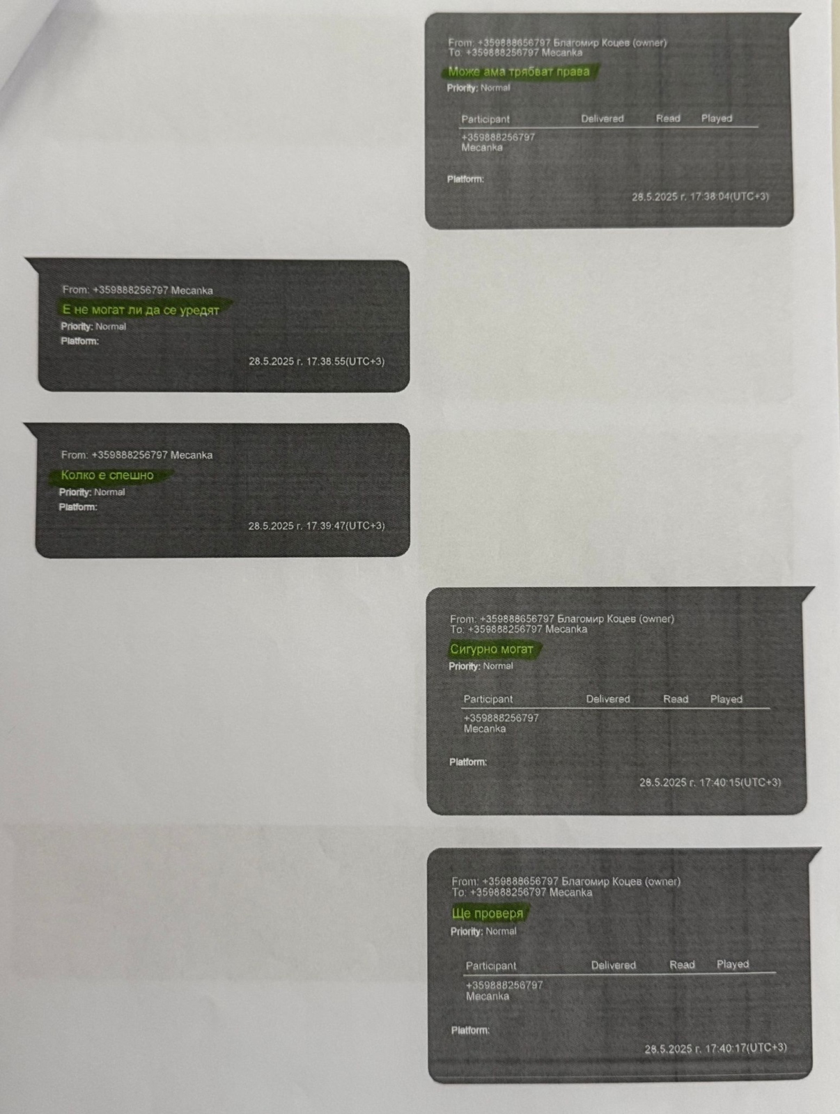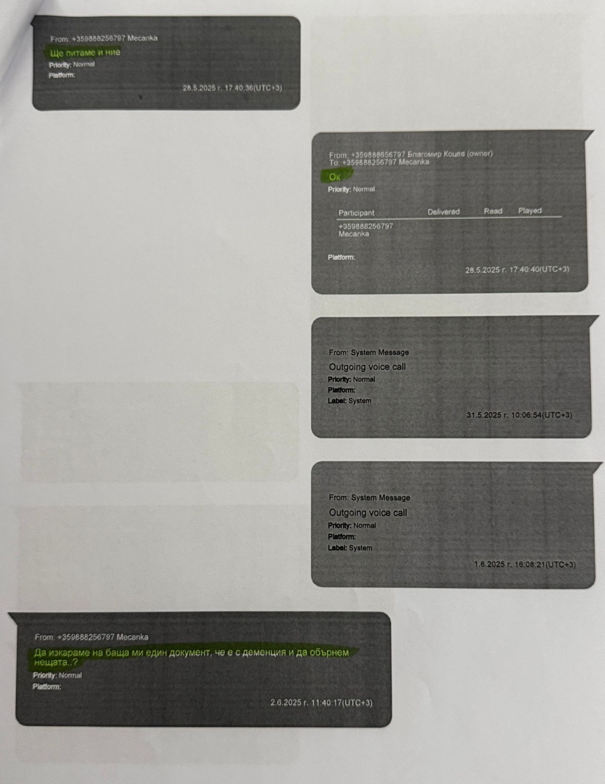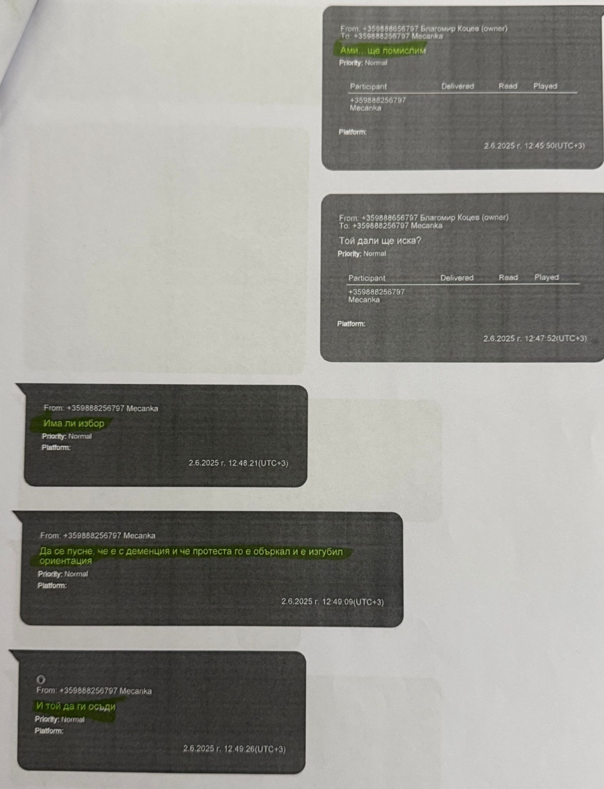 Редакцията на Skandal.bg разполага с разпечатка от Вайбър кореспонденцията между Благомир и Биляна Коцеви, приобщена по делото. От нея ясно личи, че двамата обсъждат начини да се сдобият с фалшив медицински документ, който да удостовери, че баща им страда от деменция и не може да носи отговорност за поведението си.
