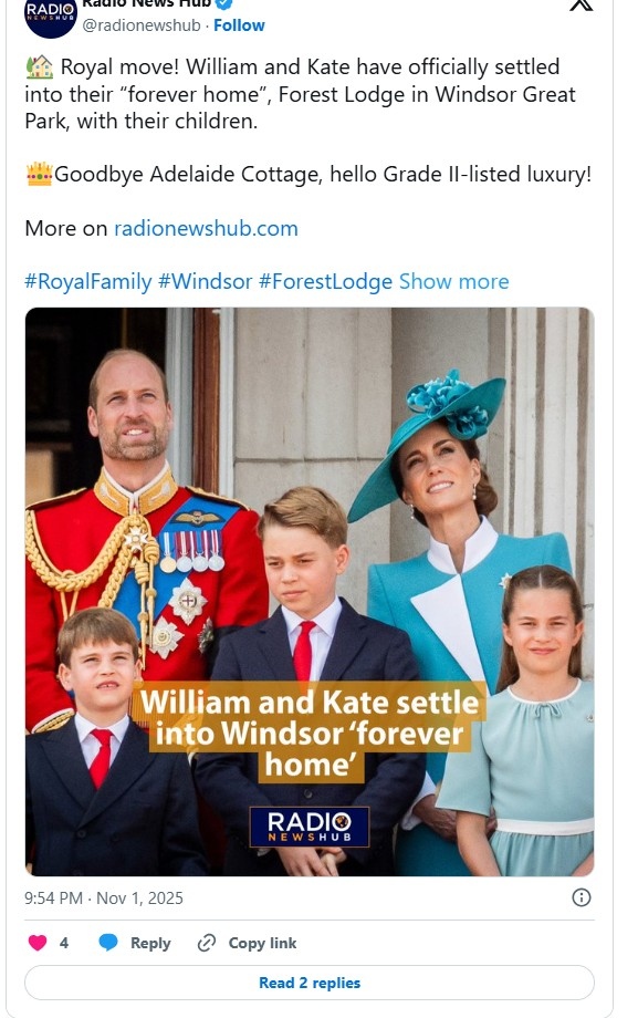 Семейството вече живее във „Форест Лодж“ - дом, разположен в имението Уиндзор, потвърдиха от двореца Кенсингтън пред ABC News в неделя.