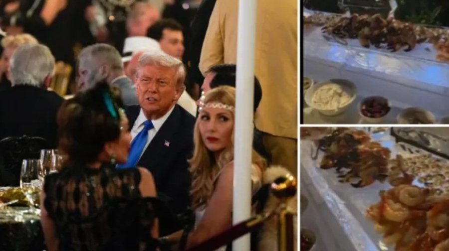 Гостите споделиха в социалните мрежи снимки от луксозното събитие, на което е бил сервиран тристепенен обяд с филе от говеждо, картофи дофинуа с трюфели, сотирани миди и десертно трио, включващо „шоколадова торта Тръмп“.
