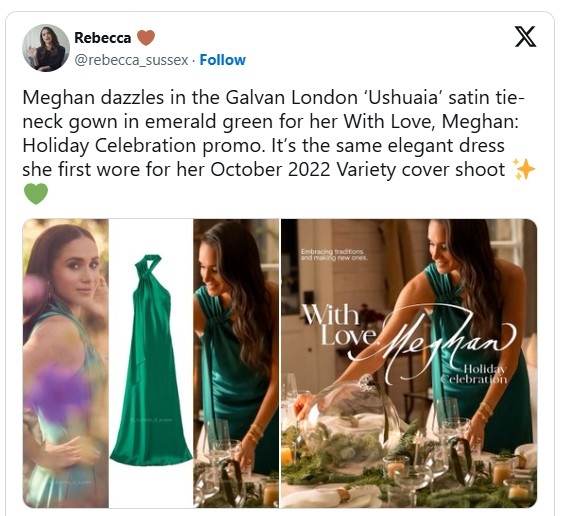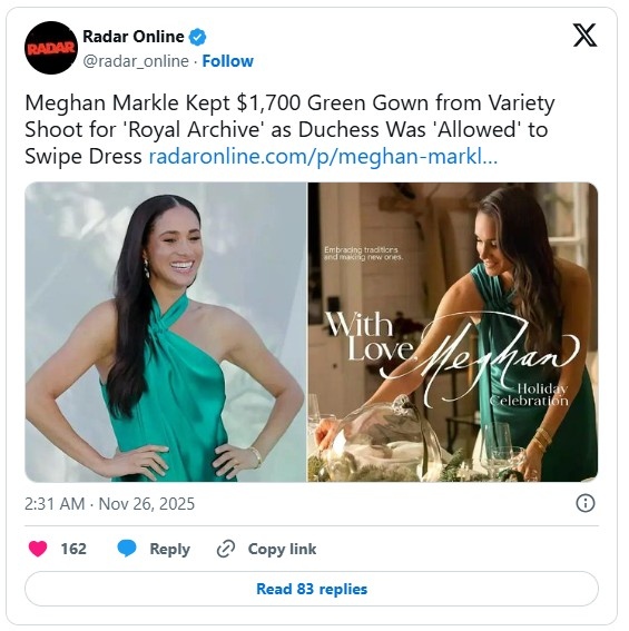 Меган Маркъл попадна в центъра на спор, след като американски медии съобщиха, че е задържала дизайнерска рокля на стойност 1695 долара от фотосесия за корицата на Variety през 2022 г. В промо видео за новото ѝ шоу „With Love, Meghan Holiday Celebration“, излъчено наскоро, херцогинята се появява в зелена рокля Galvan „Ushuaia“, която според източници е трябвало да бъде върната след снимките.