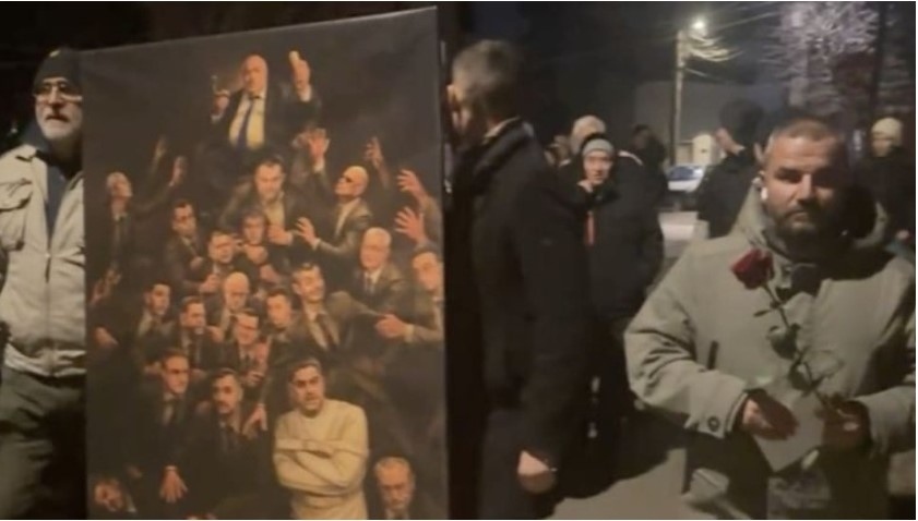 Те оставиха картина пред вратата, която по думите им изобразява „партия Мафия“, една червена роза и бял плик, докато скандираха "тръгнете си с мир". След това си тръгнаха.