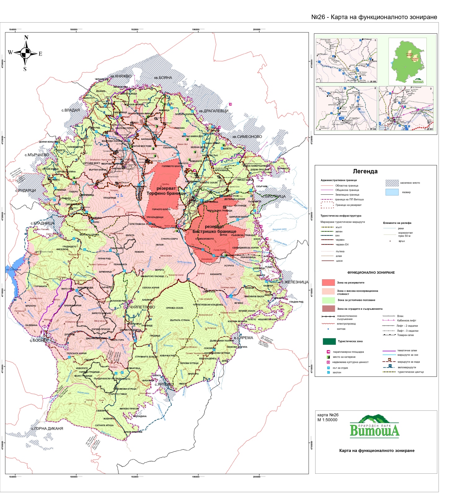 На картата, която визуализира разпределението на териториите, ски зоната е толкова малка, че от мащаба не се вижда, че е в тъмнозелено. В тези 122 хектара или 1200 декара влизат всички трасета на лифтовете, станциите към тях, ски пистите (включително „Витошко лале 1“ и „2“), трасета за ски бягане, учебни плацове, паркинги и помещенията за техническо обслужване. В тази площ са включени и елементи от ландшафта – гори, скални образувания, поляни и водоеми. Тоест, трасета за нови лифтове и писти на Витоша няма да има.