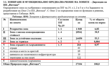 Само 122 от 27 100 хектара, колкото е територията на парк „Витоша“, са определени за ски спорт. Това се вижда от таблиците в новия план за управление, качен на 2 декември на страницата на дирекцията на парка. В зоната за туризъм числата са още по-стряскащи – само 1 хектар, или 10 декара, колкото едно футболно игрище.