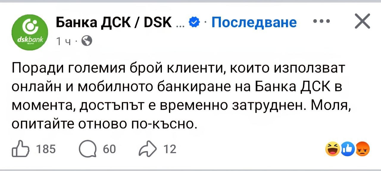 "Поради големия брой клиенти, които използват онлайн и мобилното банкиране на Банка ДСК в момента, достъпът е временно затруднен. Моля, опитайте отново по-късно."